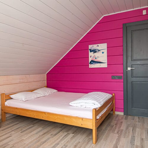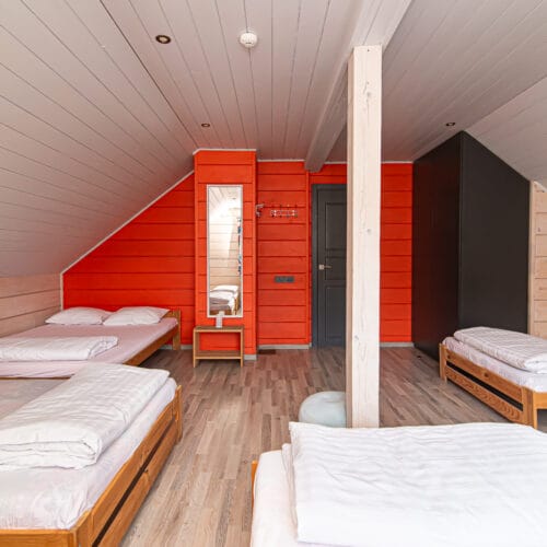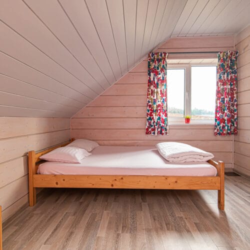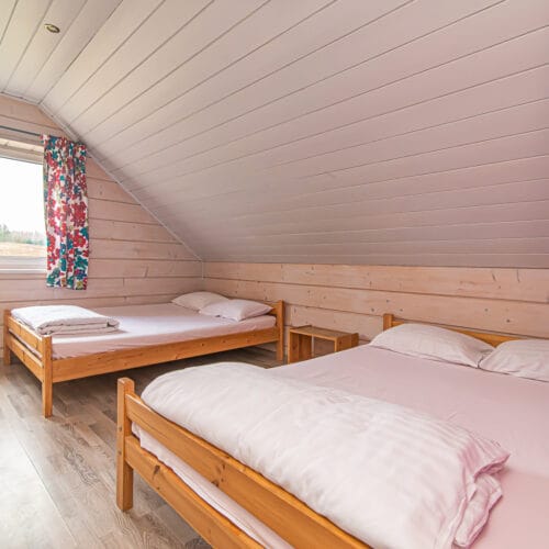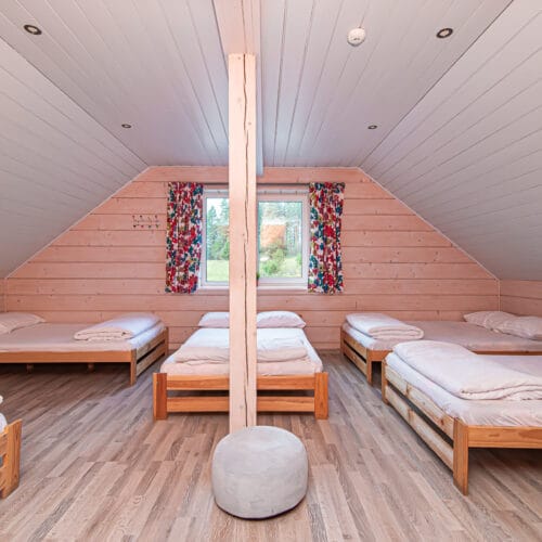 Erdvus poilsio kambarys 2 aukšte, tinkamas didesnei grupei ar šeimai. Čia įrengtos penkios 120 cm pločio dvigulės lovos ir viena 140 cm pločio lova, todėl patogiai gali ilsėtis keli svečiai. Langas orientuotas į šiaurės pusę, pro jį atsiveria vaizdas į tvenkinį ir aplinkinius žaliuojančius medžius. Visose lovose paruošta satino patalynė.