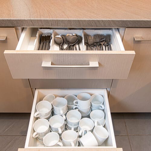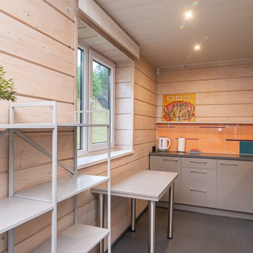 Virtuvėje paruošti visi reikalingi stalo įrankiai ir indai – lėkštės sriubai, didelės ir mažos lėkštės, desertinės lėkštutės, puodeliai arbatai ir kavai, stiklinės, taurės, stikliukai, taip pat peiliai, šakutės ir šaukštai.