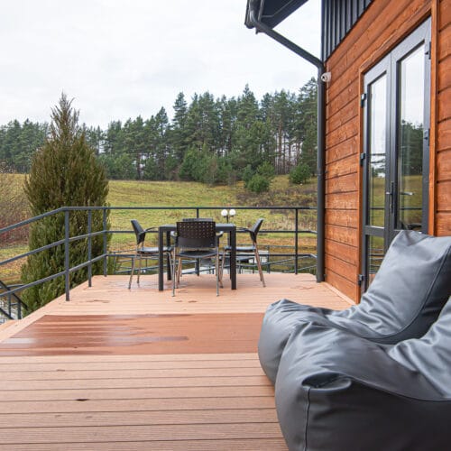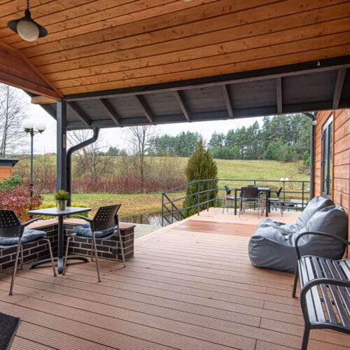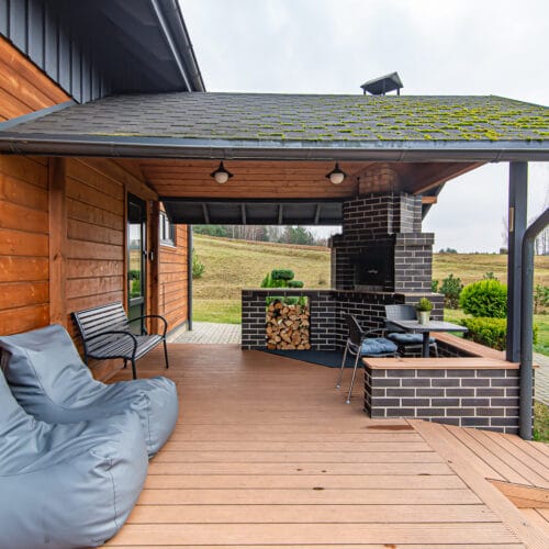 Atskira grilio zona aprūpinta iešmais, metaliniais indais ir malkomis, skirtomis maisto ruošimui lauke, kad galėtumėte patogiai gaminti ir mėgautis grilyje paruoštais patiekalais terasoje.